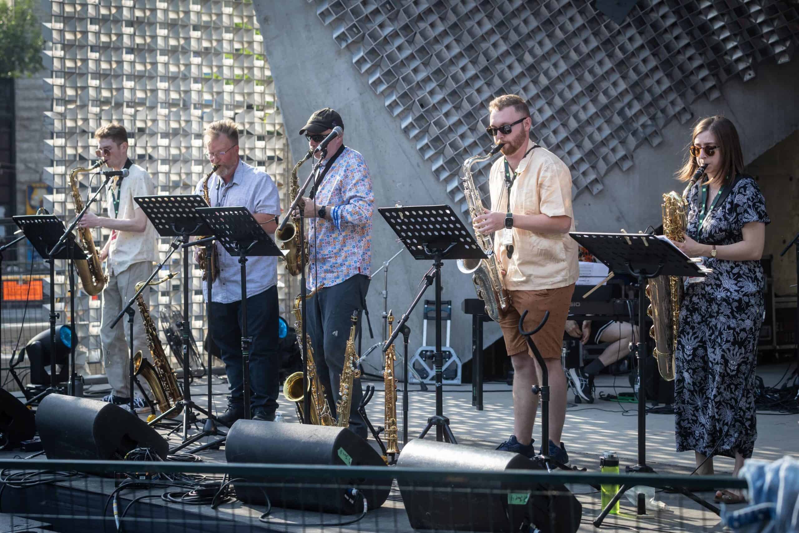 Saturday night at The Cube, Old Market Square, during the 2025 Winnipeg Jazz Festival delivered a dynamic celebration of jazz diversity and community energy. The night began with The River City Syncopators, an 11-piece ensemble reviving 1920s hot-jazz with modern enthusiasm. Their exuberant clarinet melodies and tight brass arrangements infused the plaza with toe-tapping swing—a bright, communal welcome. Next, Saxophone Nouveau took the stage, a powerhouse quartet of saxophones delivering silky harmonies and agile soloing. Their unified reed voices showcased remarkable musicianship, filling the space with layered textures that captivated listeners. Following them, Brass Queens, Brooklyn’s all-women brass powerhouse, brought bold funk-infused grooves and fierce stage presence. Their energetic, punchy charts awakened the crowd and added a contemporary spark to the evening.